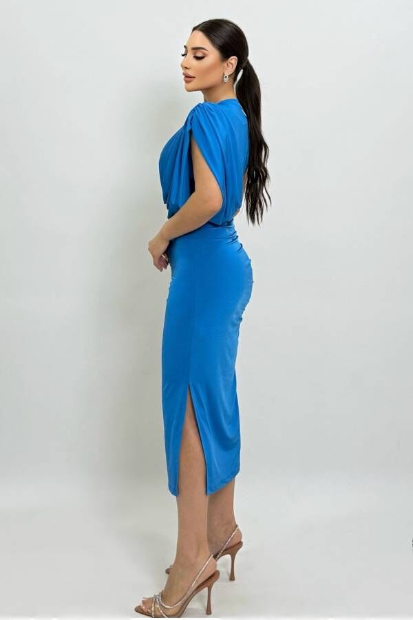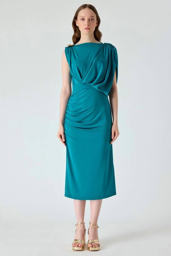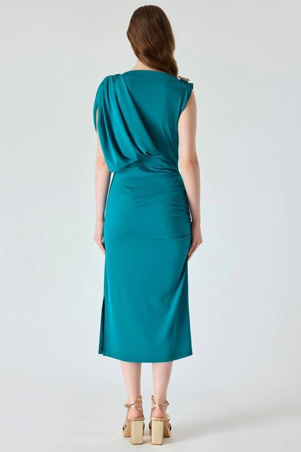Esnek dokulu yumuşak örme kumaş,asimetrik omuzlu,tek omuzu gold aksesuarlı,beli oturan formda,eteği tek taraf büzgülü,astarsız fit form şık Elbise