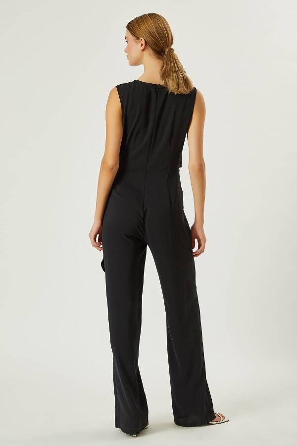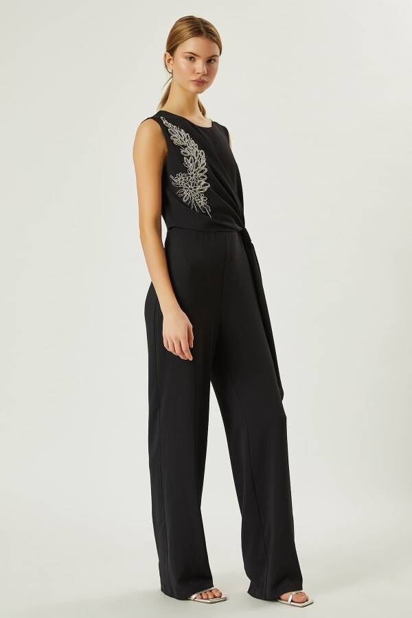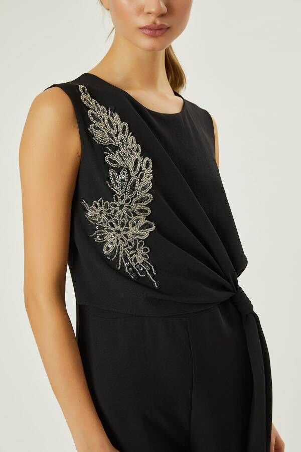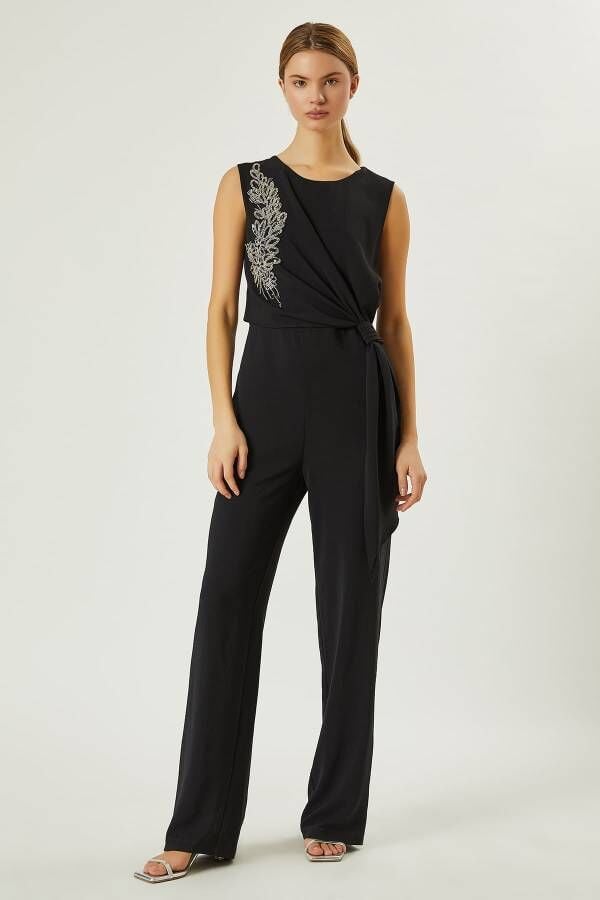 Hafif dökümlü yumuşak kumaş,yuvarlak yakalı,işleme detaylı,belden büzgülü şık Tulum